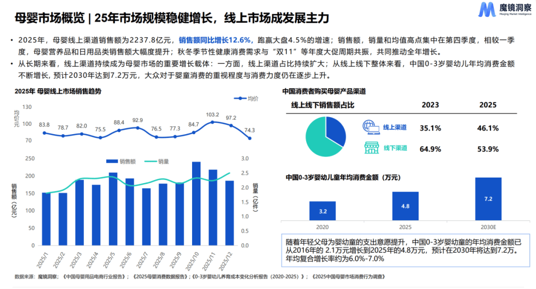 2025年母婴市场规模呈现稳健增长态势,线上市场表现尤为突出。线%的增速,且销量、均价高点集中在四季度,营养品和日用品类销售大幅提升。同时,线上渠道占比持续扩大,