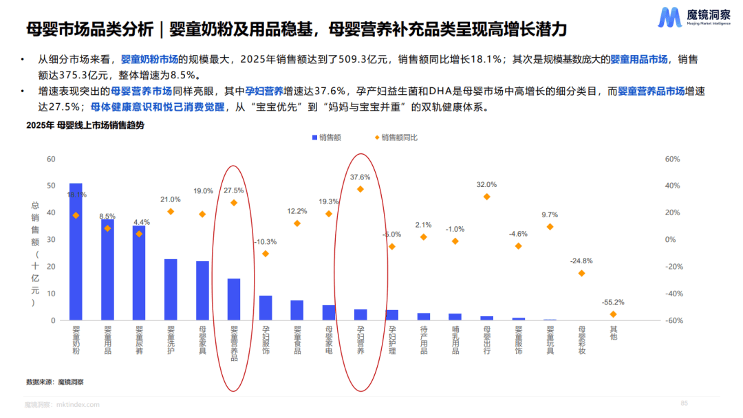 2025年销售额高达509.3亿元,且同比增长率达18.1%,紧随其后的是婴童用品市场,2025年销售额也达到375.3亿元,整体保持8.5%的增速,婴童尿裤、婴童洗护、母婴家具位列销售额前五。