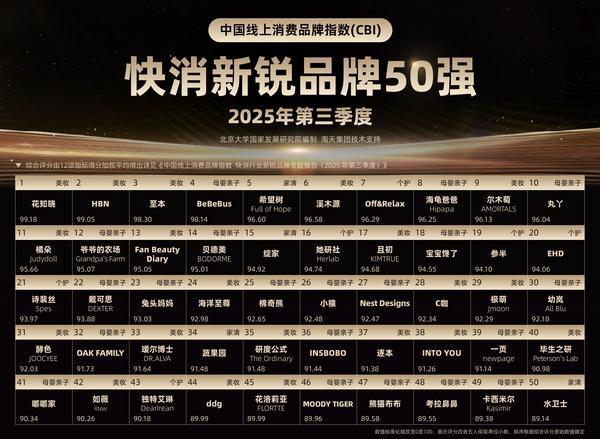 作者:emc体育官网 日期:2026-02-15 浏览: 来源:emc体育2026年2月9日,北大国发院依托淘宝天猫平台2025年第三季度的真实消费行为,发布了“快消行业新锐品牌榜”,聚焦日用个护、日用清洁、日用美妆与母婴亲子四个快消子行业的新兴品牌。花知晓、HBN、至本跻身榜单前三,BeBeBus成为母婴行业第一,希望树成为家清行业第一,Off&Relax成为个护行业第一。